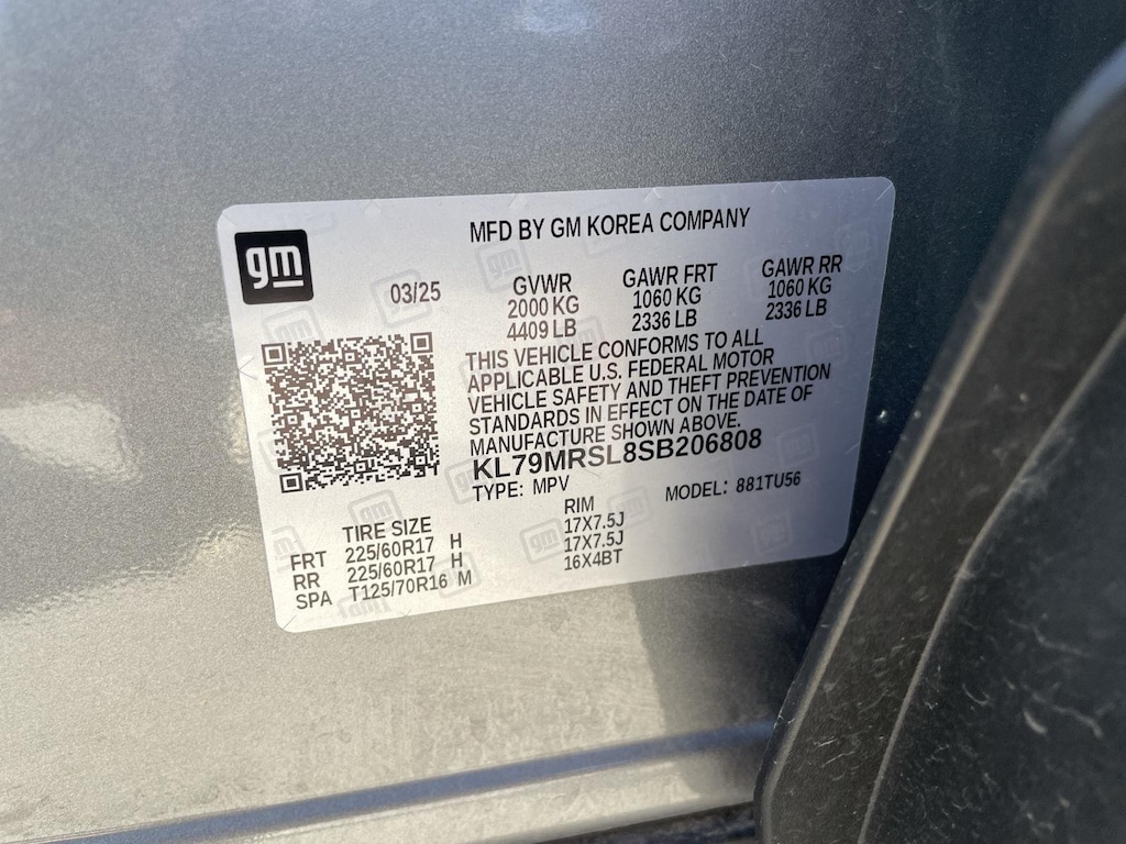 EMISSIONS, FEDERAL REQUIREMENTS, ENGINE, ECOTEC 1.3L I3 TURBO DOHC SIDI WITH VARIABLE VALVE TIMING (VVT), TRANSMISSION, 9-SPEED AUTOMATIC, AXLE, 3.17 FINAL DRIVE RATIO, WHEELS, 17 (43.2 CM) HIGH GLOSS BLACK MACHINED ALUMINUM, TIRES, 225/60R17 ALL-SEASON, BLACKWALL, STERLING GRAY METALLIC, SEATS, FRONT BUCKET, JET BLACK, CLOTH SEAT TRIM, AUDIO SYSTEM, 11 DIAGONAL HD COLOR TOUCHSCREEN, AM/FM STEREO., LICENSE PLATE BRACKET, FRONT