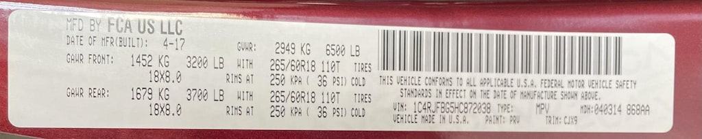 NORMAL DUTY SUSPENSION, ENGINE: 3.6L V6 24V VVT UPG I W/ESS, TRANSMISSION: 8-SPEED AUTOMATIC (845RE), QUICK ORDER PACKAGE 23H, 3.45 REAR AXLE RATIO, WHEELS: 18 X 8.0 TECH GRAY ALUMINUM, TIRES: P265/60R18 BSW AS LRR, VELVET RED PEARLCOAT, BLACK, LEATHER TRIMMED BUCKET SEATS, GVWR: 6,500 LBS, MANUFACTURER'S STATEMENT OF ORIGIN To be sure and not miss out give us a call and schedule a test drive!