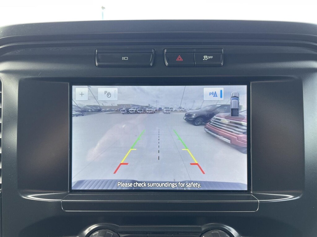 - The vehicle is equipped with a camera that displays an image of the area behind the vehicle on an interior display.