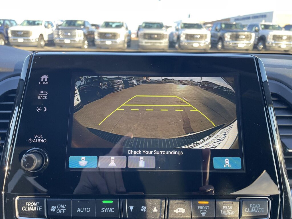 - The vehicle is equipped with a camera that displays an image of the area behind the vehicle on an interior display.